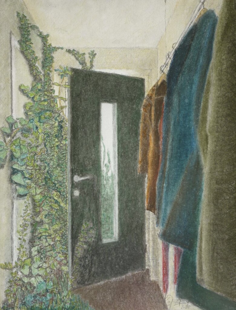 Hogerop (Higher up), 2023, 50 x 65 cm, houtskool, syberisch krijt en droog pastelkrijt op papierTurks fruit (Turkish delight), 2023, 100 x 75 cm, acryl op canvas